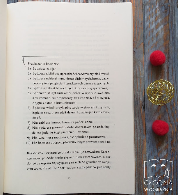 Jednym z najbardziej intrygujących elementów tej powieści był dla mnie świat przedstawiony, w którym ludzkość osiągnęła taki stan wiedzy i rozwoju technologii, że wyeliminowała wszelkie choroby dzięki obecnym we krwi nanitom, a na podstawie próbki DNA jest w stanie po pierwsze odrodzić kogoś nawet po poważnym wypadku (jedynie spalenie jest nieodwracalne), a po drugie wielokrotnie „zawrócić go znad krawędzi”, czyli odmłodzić każdy organizm do maksymalnie takiego stanu, jakby znowu miało się 21 lat. Nie ma tu już podziałów na kraje, ani też żadnego rodzaju rządzących – bo opiekę nad ludzkością roztacza Thunderhead – przyjazna sztuczna inteligencja, która osiągnęła samoświadomość. Zapewnia ona miejsce do życia, pożywienie, a nawet dochód minimalny wszystkim mieszkańcom Ziemi. Jedyne, czego nie kontroluje i w co nie ingeruje to Kosodom, czyli organizacja kosiarzy. Ich zadaniem jest przeprowadzanie zbiorów, czyli typowanie ludzi, którzy umrą na zawsze, przy czym muszą osobiście odebrać wybranym osobom życie. Postępują według ściśle określonych zasad – spisanych w formie dziesięciu przykazań, m.in. muszą prowadzić dziennik (a to bardzo istotny element tej opowieści) oraz nie mogą posiadać dóbr doczesnych. I choćby ze względu na to oryginalne uniwersum warto sięgnąć po tę powieść.